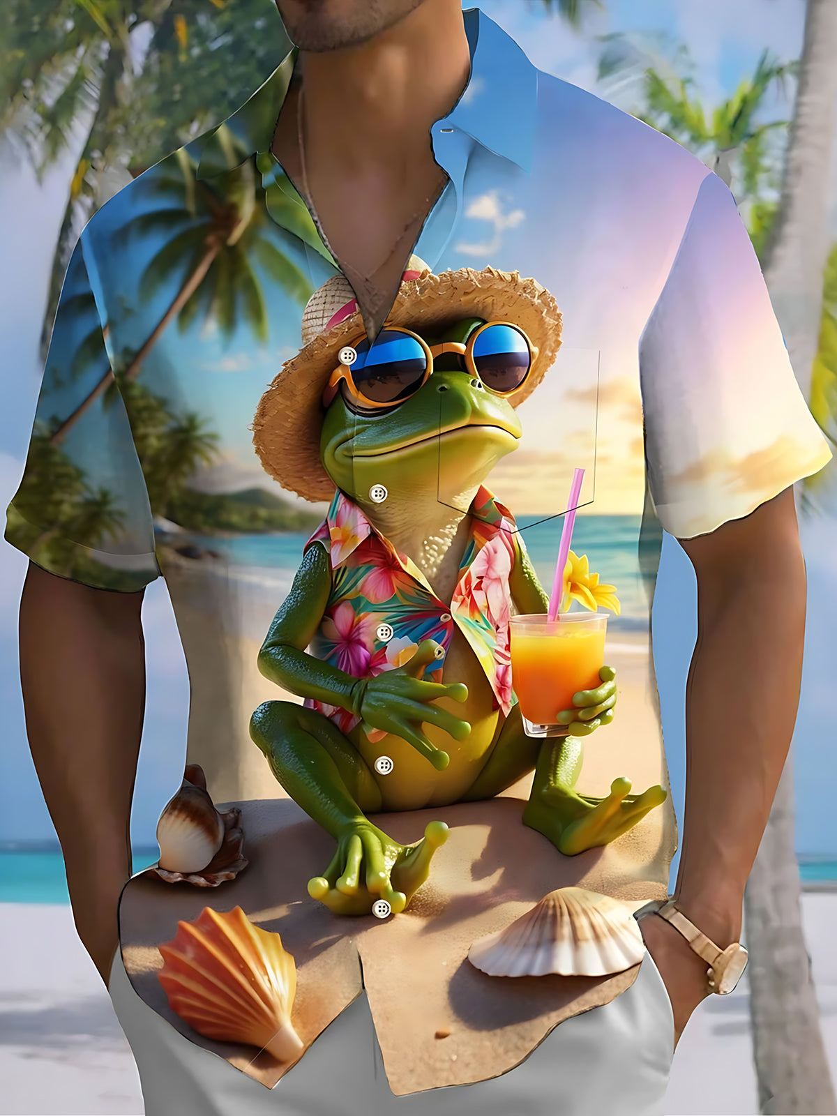 Hawaiian Vacation Frog Print Men's Pocket Short Sleeve Shirts